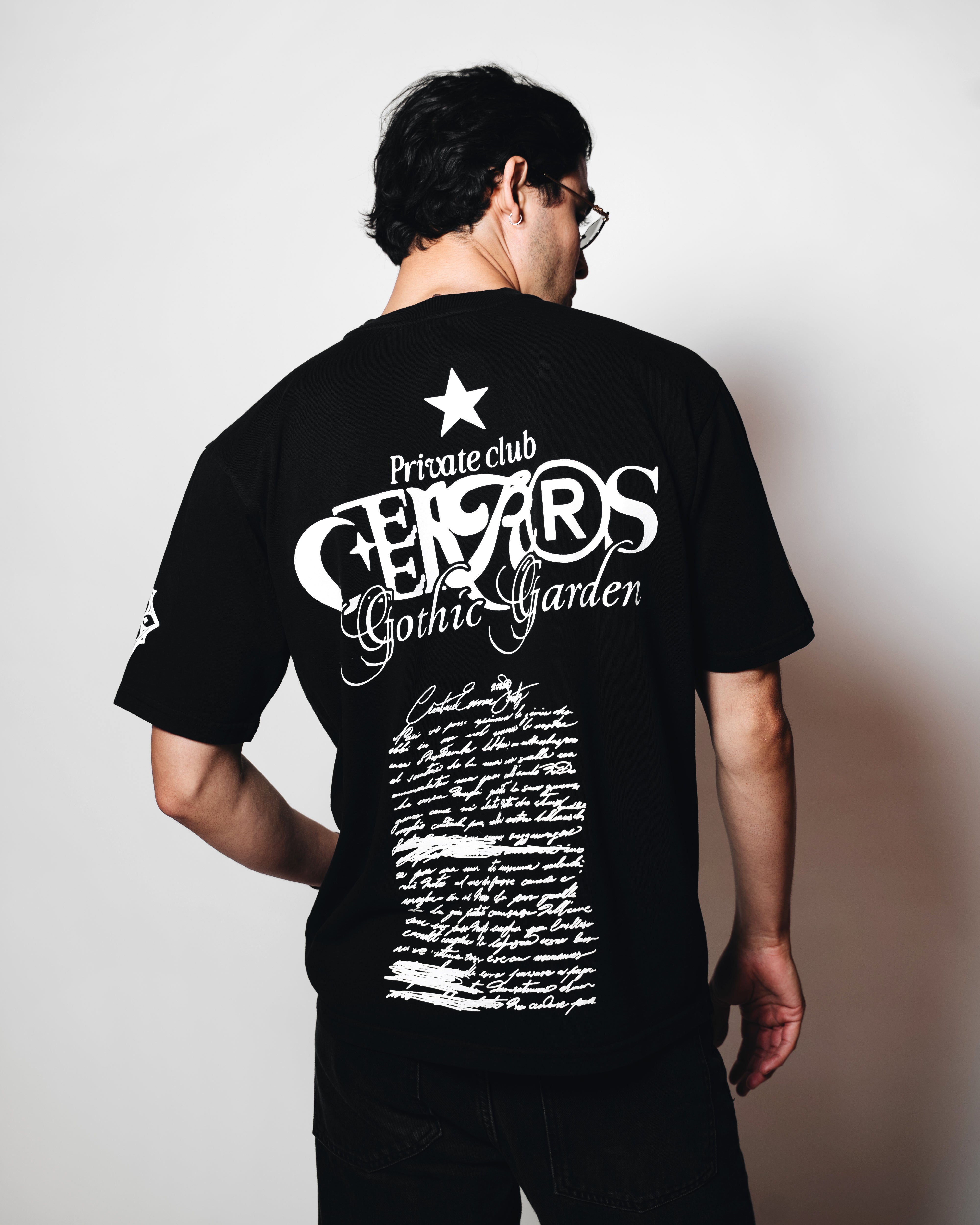 Inspirada en la estética de los clubes privados, la tipografía clásica y los manifiestos escritos a mano. Esta prenda funciona como un documento visual de Gothic Garden: una declaración de principios donde el lujo se expresa a través del silencio, la simetría y la palabra.